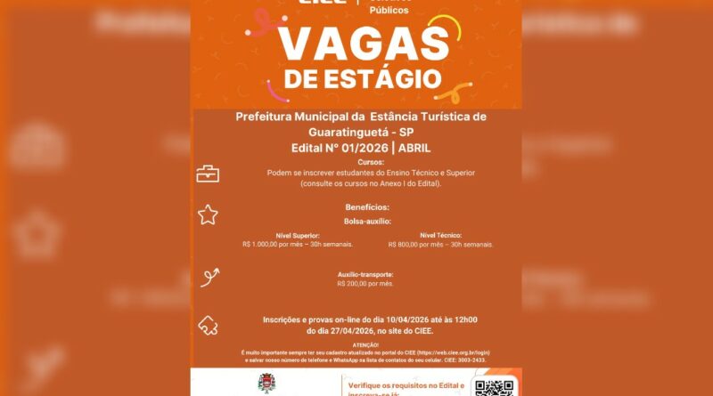 A Prefeitura de Guaratinguetá, em parceria com o CIEE, informa a abertura do novo Processo Seletivo de Estágio – Edital nº 01/2026 (abril).