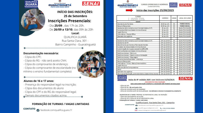 Ler maisA Prefeitura de Guaratinguetá, em parceria com o SENAI, está com inscrições abertas para o 4º módulo do Qualifica Guará