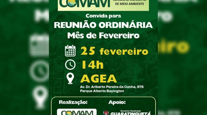 A reunião é aberta ao público e tem como objetivo fortalecer o diálogo e a participação da sociedade nas ações voltadas ao meio ambiente no município, com apoio da Prefeitura de Guaratinguetá.