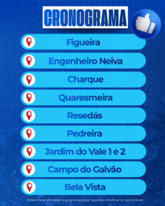 Os serviços acontecem de forma contínua, seguindo a agenda, e podem sofrer alterações de acordo com as condições climáticas.