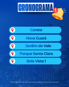 Confira o cronograma da Limpeza Urbana desta semana, com os locais que serão atendidos pelas equipes de 07 a 10 de Abril.