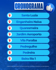 Os serviços acontecem de forma contínua, seguindo a agenda, e podem sofrer alterações de acordo com as condições climáticas.