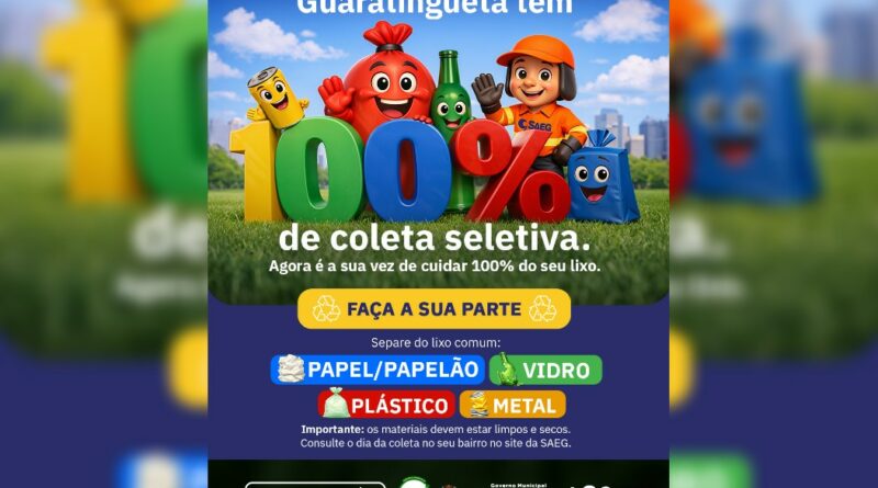 A partir desta segunda-feira, 30 de março, Guaratinguetá passa a contar com a coleta seletiva em toda a área urbana do município. A iniciativa representa um importante avanço nas ações de sustentabilidade, contribuindo para a preservação do meio ambiente e para a destinação correta dos resíduos.