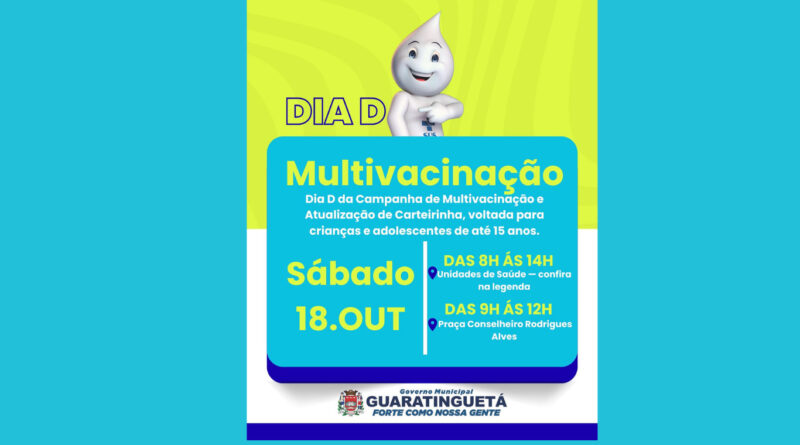 A Prefeitura de Guaratinguetá, por meio da Secretaria de Saúde, realiza neste sábado, 18 de outubro, o Dia D da Campanha de Multivacinação e Atualização de Carteirinha, voltada para crianças e adolescentes de até 15 anos.