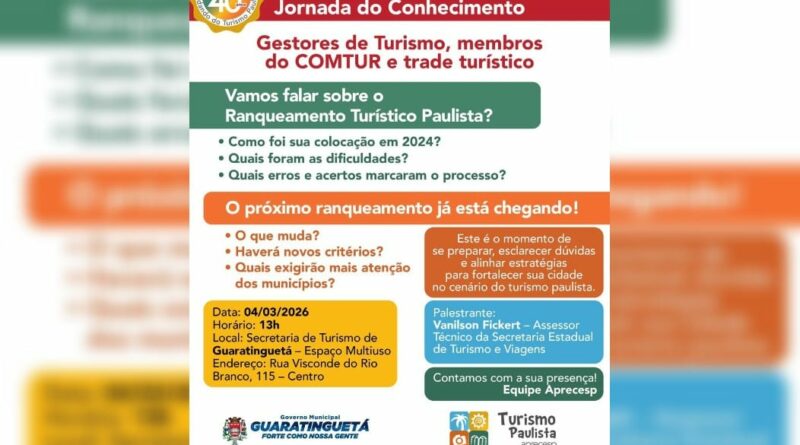 Guaratinguetá será sede de um debate fundamental sobre o Ranqueamento Turístico Paulista. O evento, realizado pela APRECESP, acontece nesta quarta-feira (04), no Espaço Multiuso da Secretaria de Turismo.