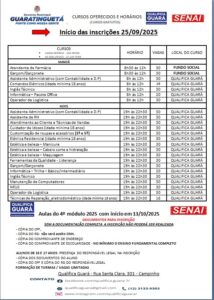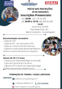 A Prefeitura de Guaratinguetá, em parceria com o SENAI, está com inscrições abertas para o 4º módulo do Qualifica Guará 2025, com cursos gratuitos de qualificação profissional.