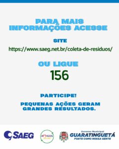 A SAEG (Companhia de Serviços de Água, Esgoto e Resíduos de Guaratinguetá) informa que, a partir do dia 19, a coleta seletiva será ampliada e passará a atender 77% da população que reside na área urbana do município.